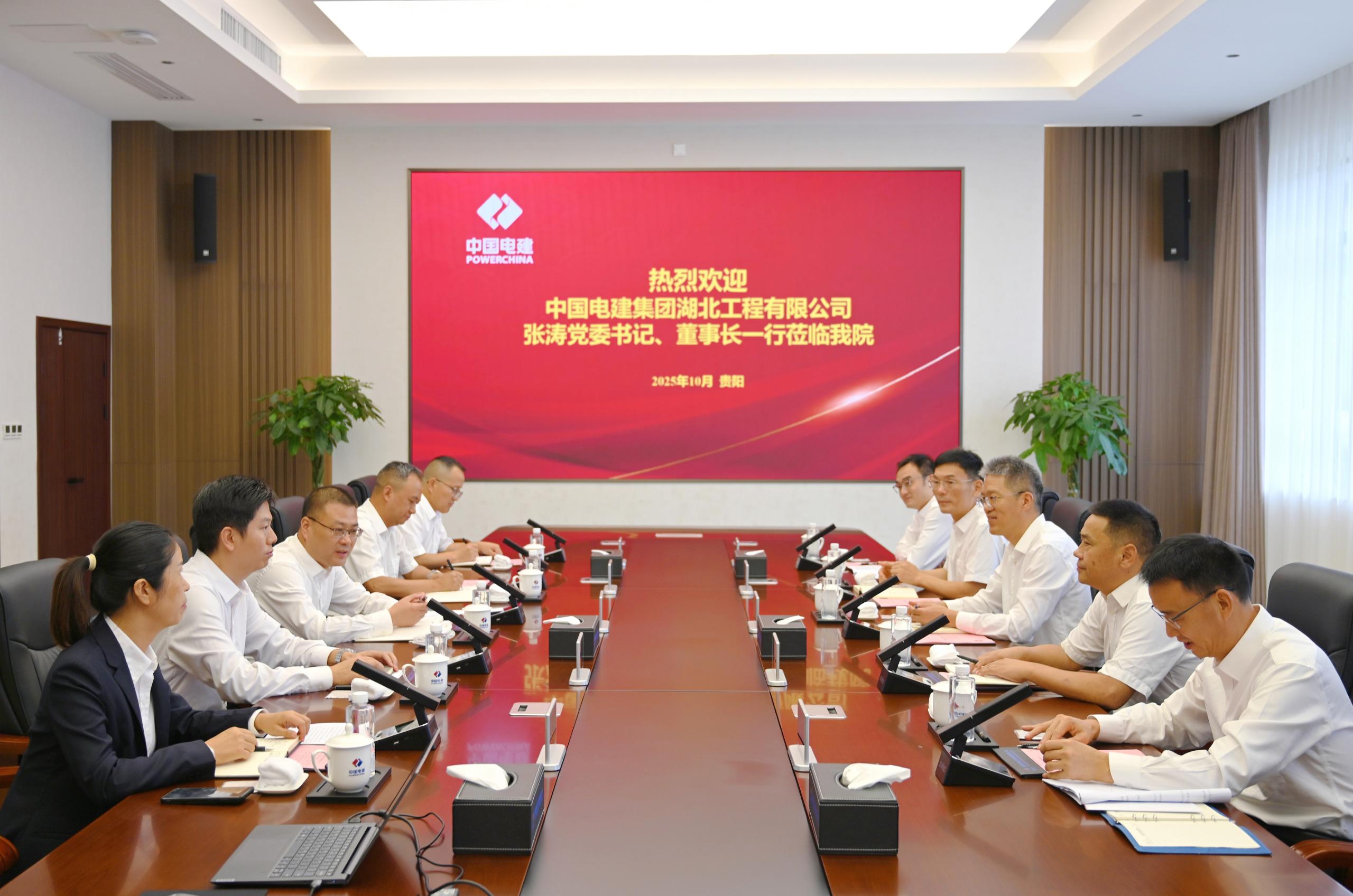 10月15日上午,在拜會貴陽院武建學時,張濤簡要介紹了湖北工程公司的基本情況和資質能力優勢,并對貴陽院的支持與幫助表示感謝。他指出,湖北工程公司與貴陽院業務優勢互補、合作基礎牢固,希望雙方進一步加強交流互動,聚焦重點領域、重點項目,持續深化務實合作,攜手共享發展成果。武建學對張濤一行的到訪表示歡迎,并介紹了貴陽院的歷史沿革及業務發展情況。他表示,貴陽院與湖北工程公司同屬中國電建骨干子企業,希望雙方進一步強化信息互通、資源共享,在能源電力、科技創新等領域實現更深入、更廣泛的合作。交流會前,武建學陪同張濤一行參觀了貴陽院企業展廳。